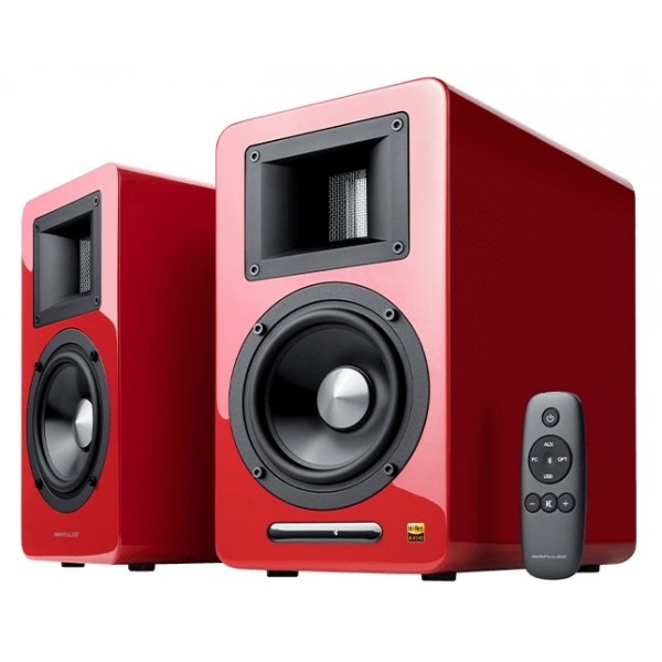 Edifier Airpulse A100 Hi-Res Audio Bluetooth Speakers, Color: Red, 2.0/ L/R(Treble):10W + 10W, L/R(Woofer): 40W + 40W RMS, Horn-loaded ribbon tweeter, Audio in: AUX, PC, USB, Optical, Bluetooth, Built-in Amplifier and subwoofer output, remote control, wooden, designed by Phil Jones