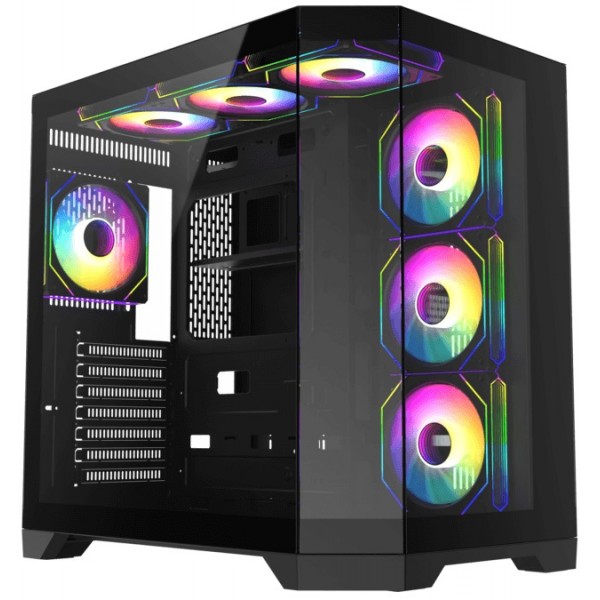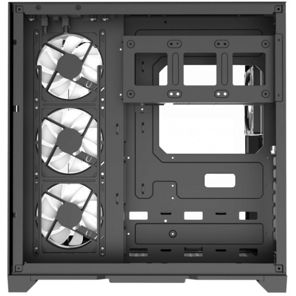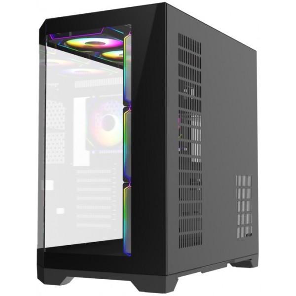 Корпус с акцентом на охлаждение — 4 предварительно установленных 120-мм ARGB вентилятора: 3 под правой стороной и один сзади корпуса.